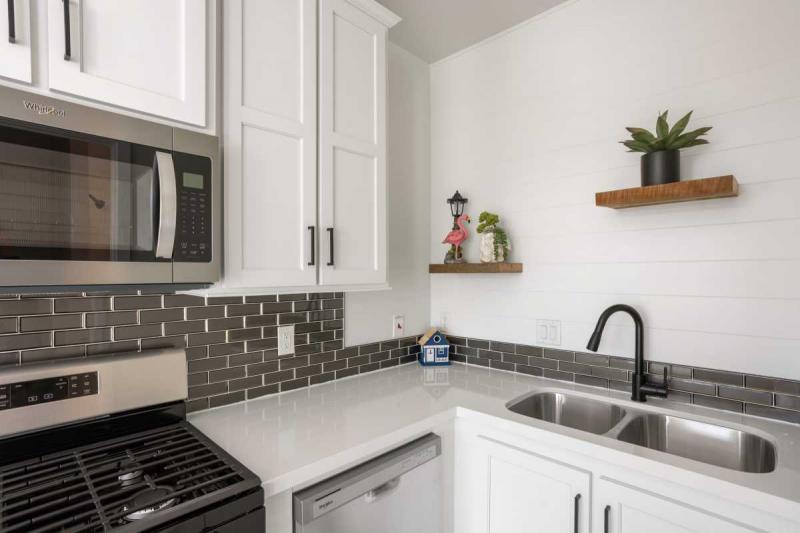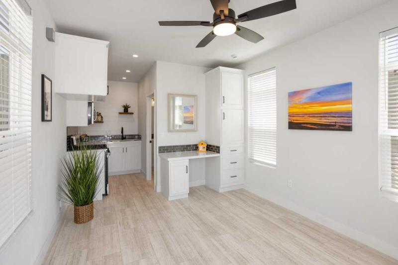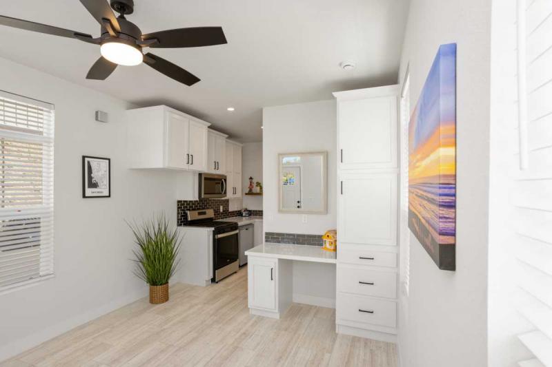 Step inside to an open, light-filled studio layout that maximizes every inch of its 251 square feet. The upgraded kitchen shines with elegant quartz countertops, stainless steel appliances including a dishwasher, garbage disposal, microwave, and oven – ideal for whipping up quick meals after a day at the beach. The full bathroom features a tub/shower combo for ultimate convenience, while built-in storage, a desk area, ample windows, and a ceiling fan create a bright, airy vibe that’s ready for your personal touches. Add a Murphy bed or sofa bed to transform it into a sleeping haven, or use it as a serene retreat. Outside, the charming full front porch beckons for morning coffee or sunset cocktails, adding that perfect touch of outdoor charm.
